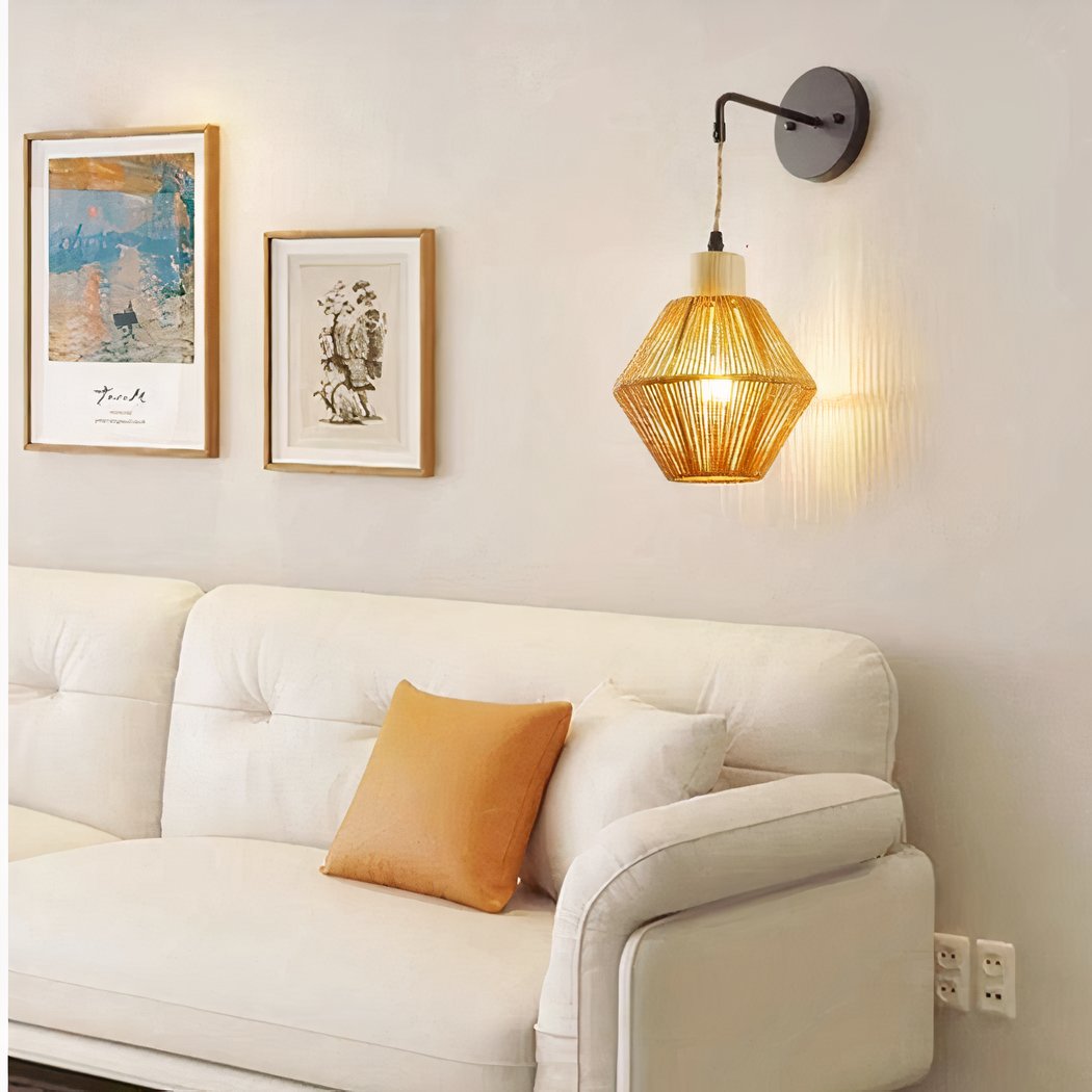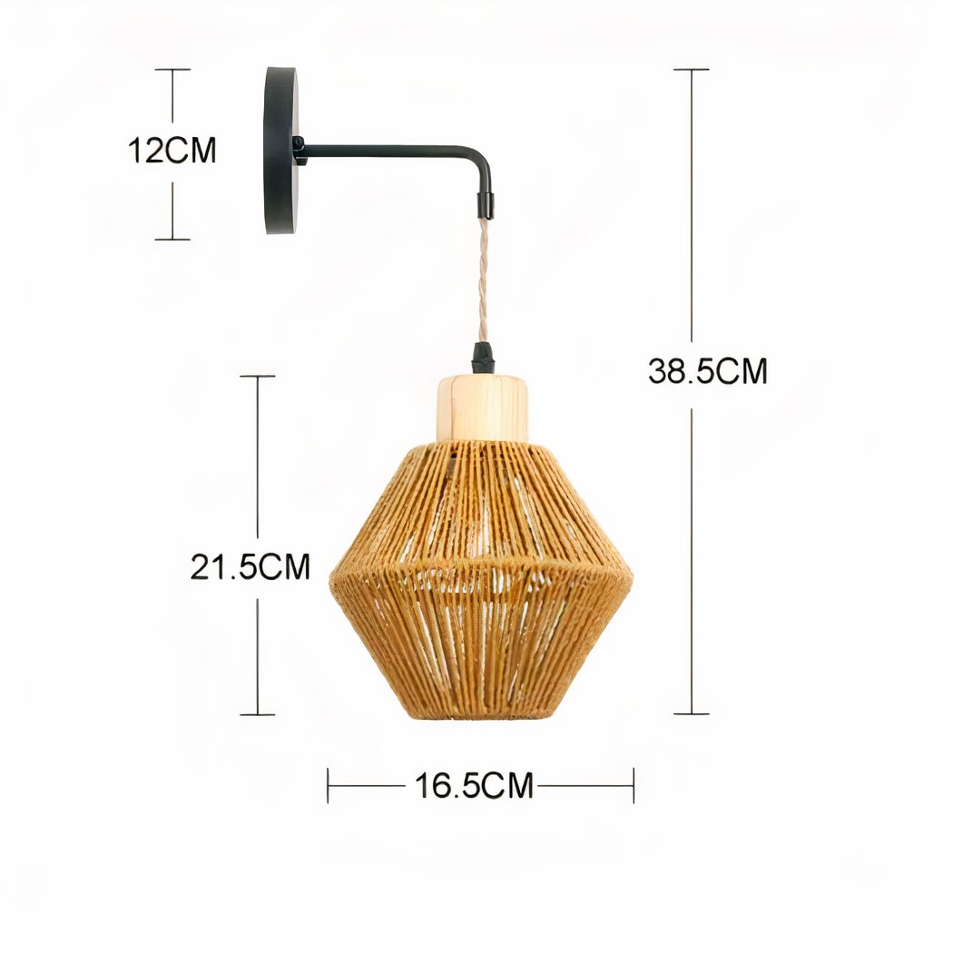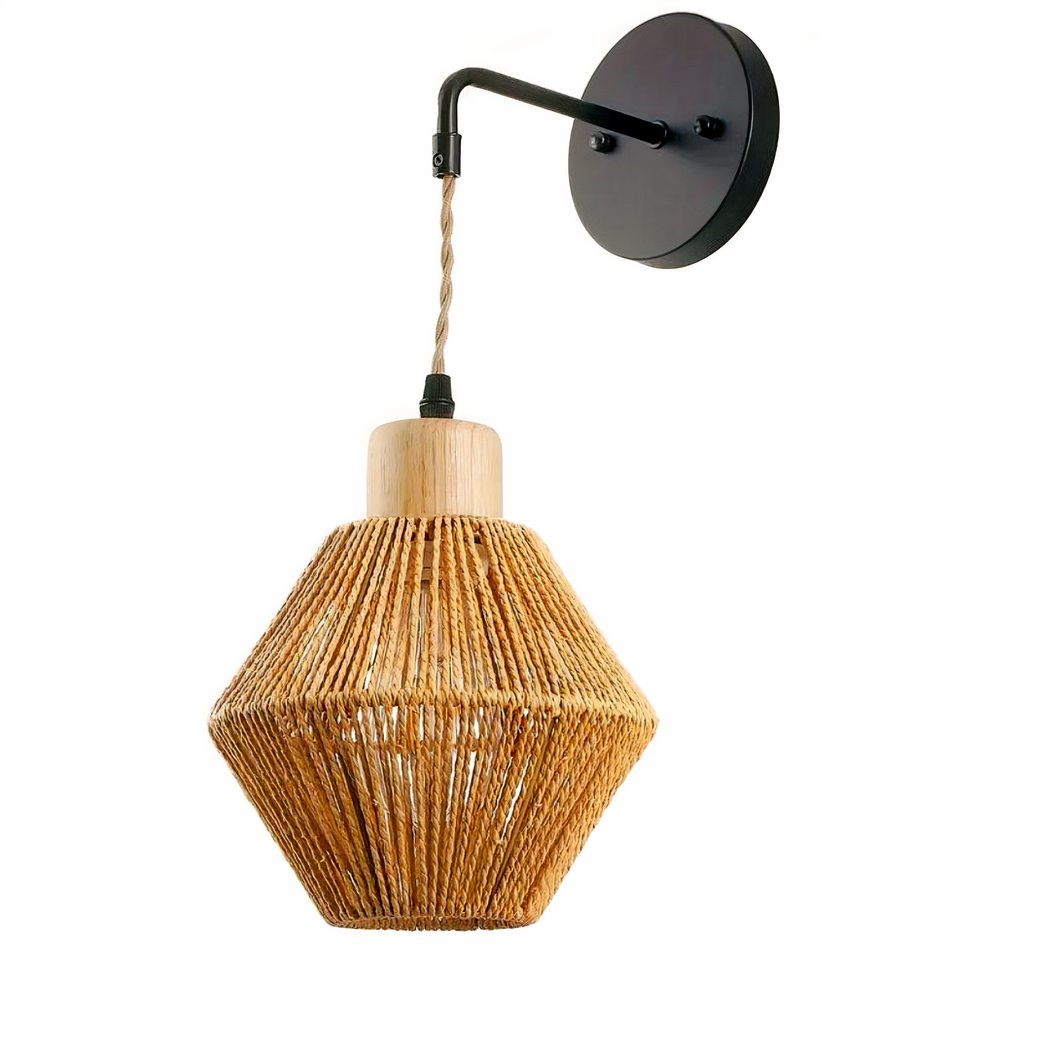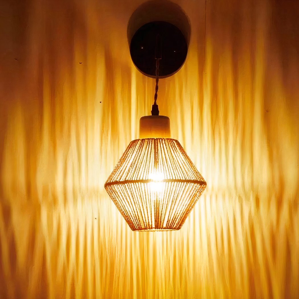 Onze wandlamp van henneptouw is de perfecte belichaming van bohemienstijl, met zacht licht dat door de gevlochten vezels schijnt en zo een ontspannen sfeer creëert in elke kamer.