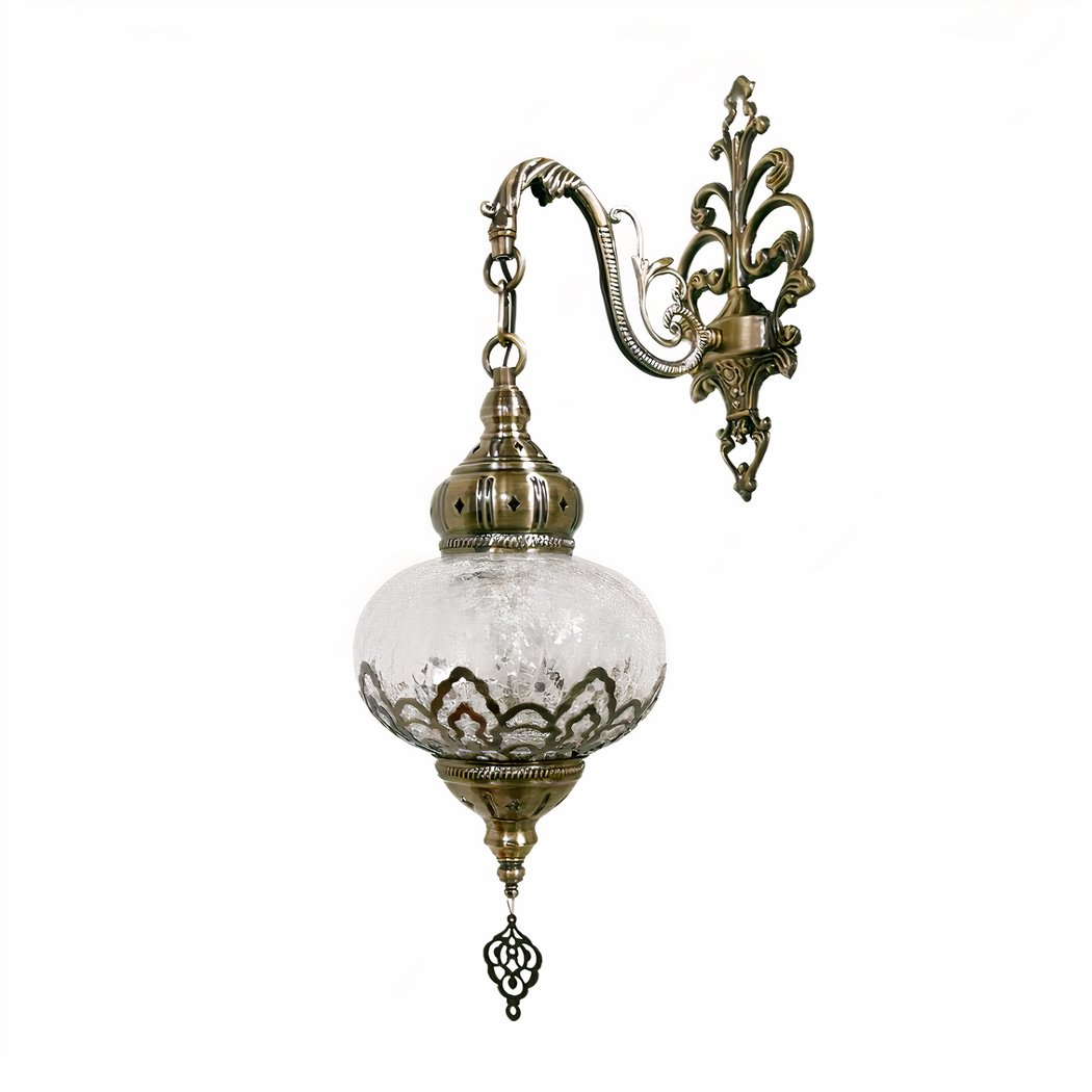 Creëer een betoverende sfeer met onze oosterse wandlamp. Geciseleerd metaal ontmoet gebarsten glas in perfecte harmonie. Dankzij de praktische muurbeugel is deze lamp eenvoudig te integreren in je interieur en zorgt ze voor subtiele verlichting en een warme sfeer.