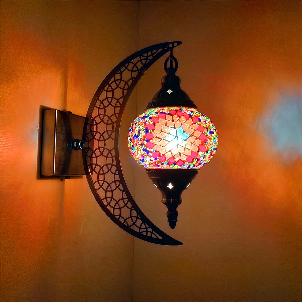 Geef je interieur een vleugje exotisch en authentiek met onze maanwandlamp. De glazen kap, overladen met veelkleurige mozaïeken in betoverende patronen, creëert een betoverende, sprookjesachtige sfeer geïnspireerd door oosterse paleizen.