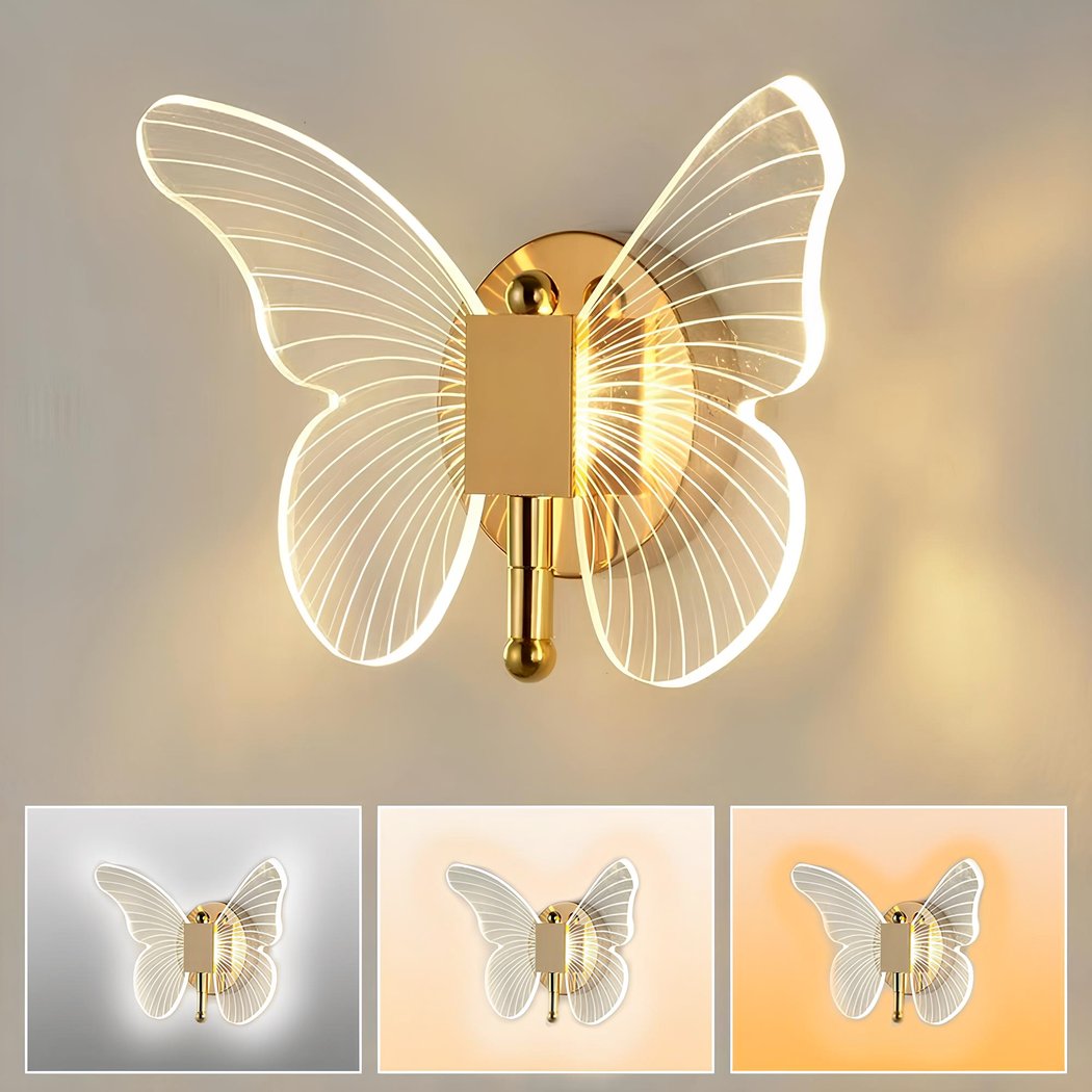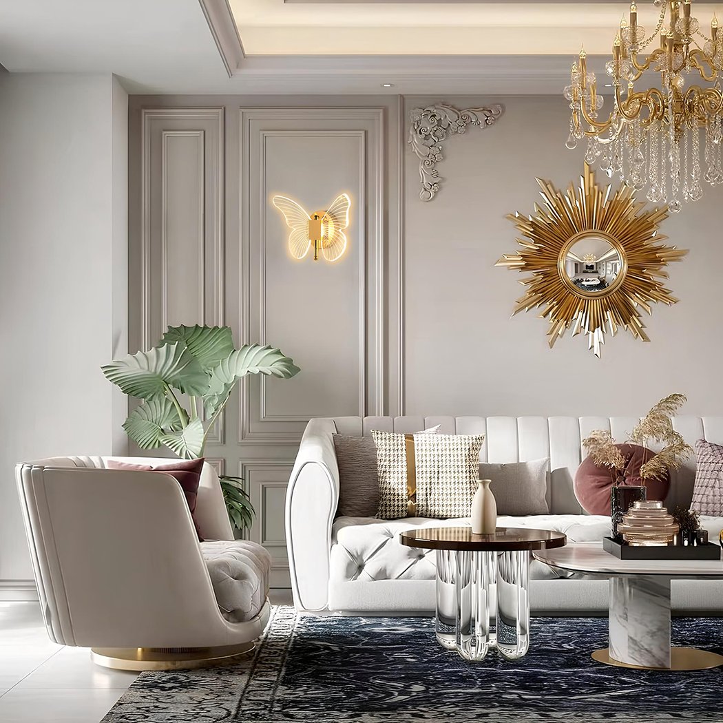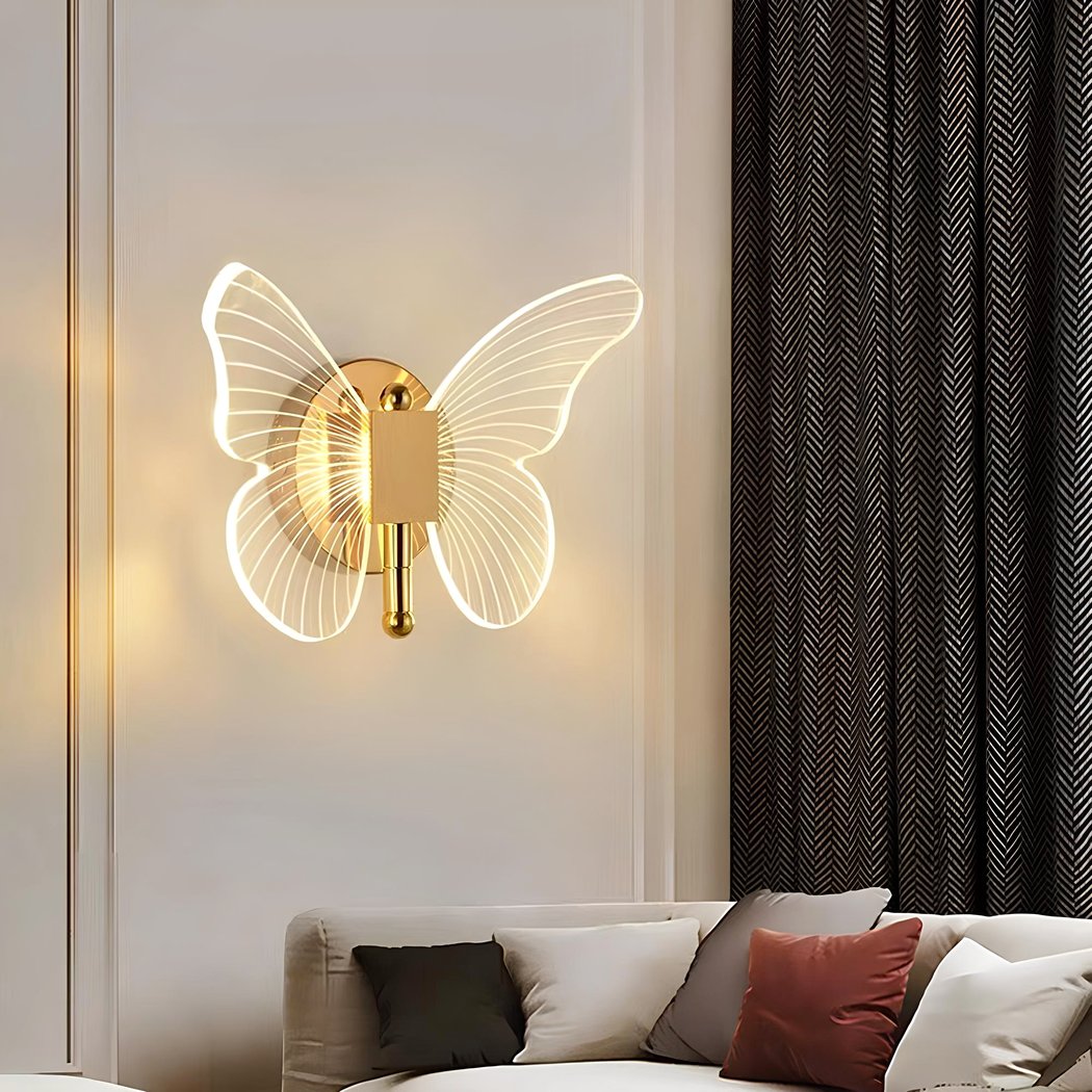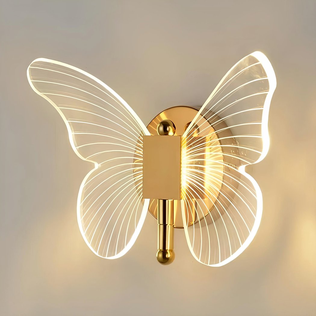 De gouden structuur van deze wandlamp benadrukt haar elegantie, terwijl de acrylvleugels een artistieke en functionele dimensie toevoegen. De vleugels verspreiden het licht subtiel en creëren een zachte, betoverende gloed.