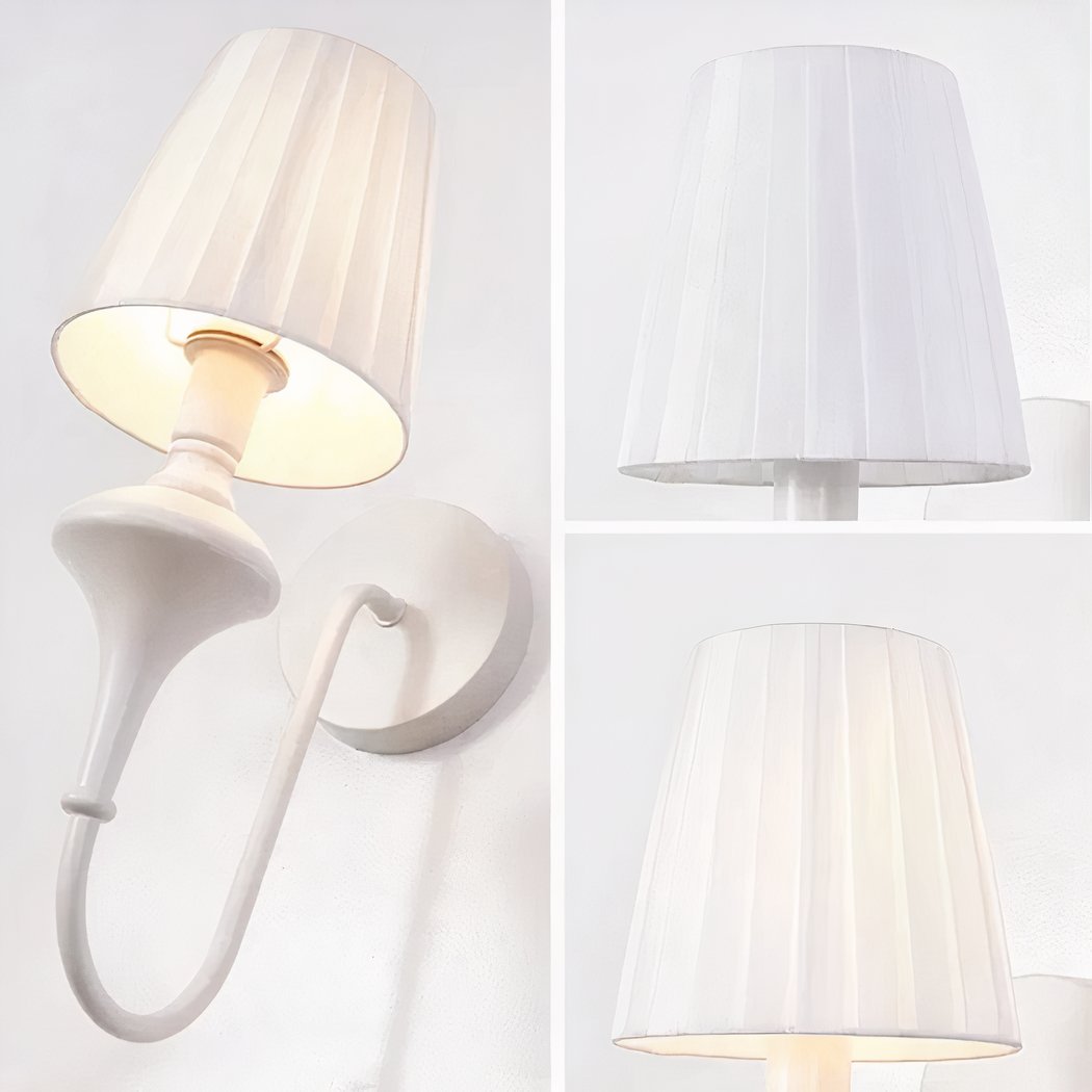 Zit comfortabel in je woonkamer, badend in de zachte gloed van onze smeedijzeren wandlamp. Met haar smetteloos witte stoffen kap creëert ze meteen een rustgevende sfeer, perfect om te ontspannen na een lange dag of om in weg te kruipen met een goed boek voordat je in slaap valt.