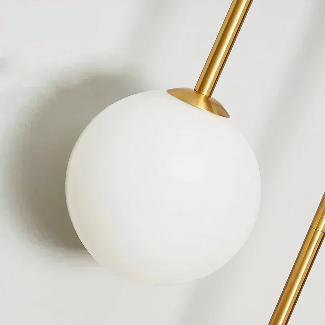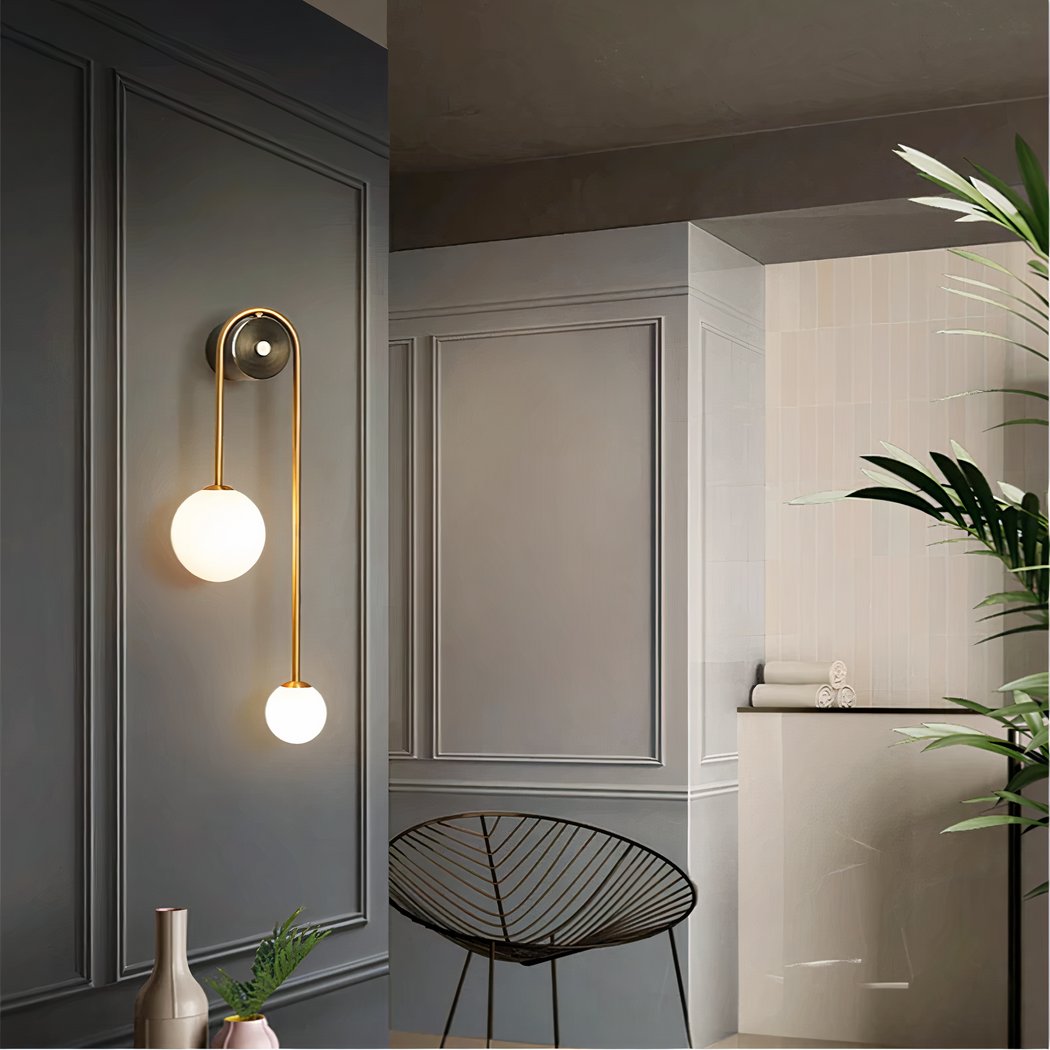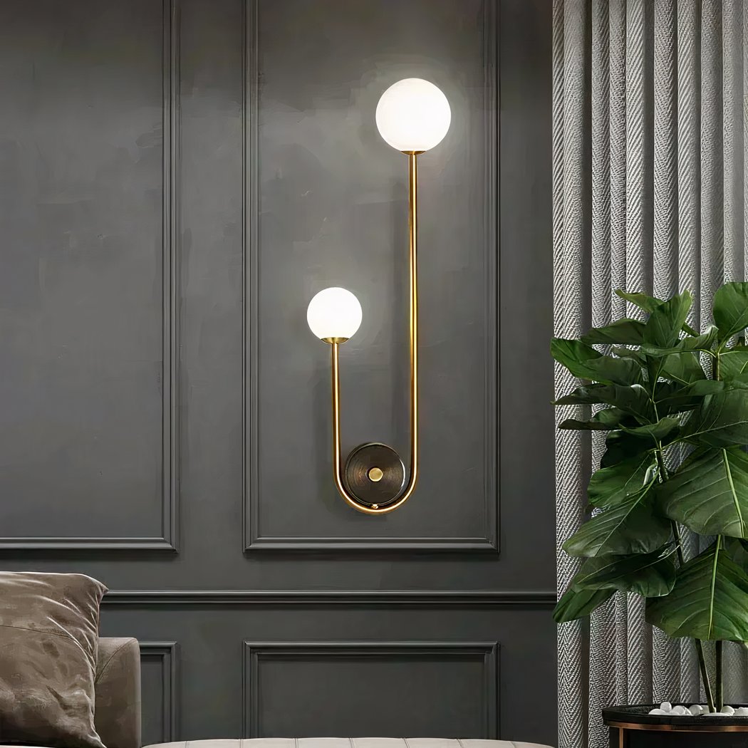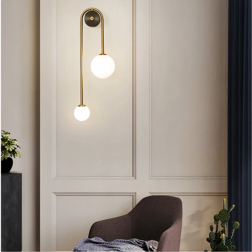De wandlamp met twee bollen heeft een origineel ontwerp dat een modern tintje geeft aan elke kamer. De twee lichtballen worden vastgehouden door een gouden steel voor een elegante touch.