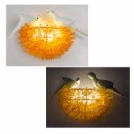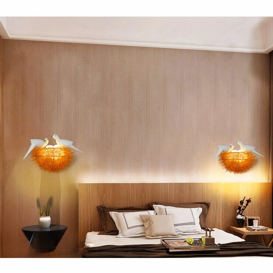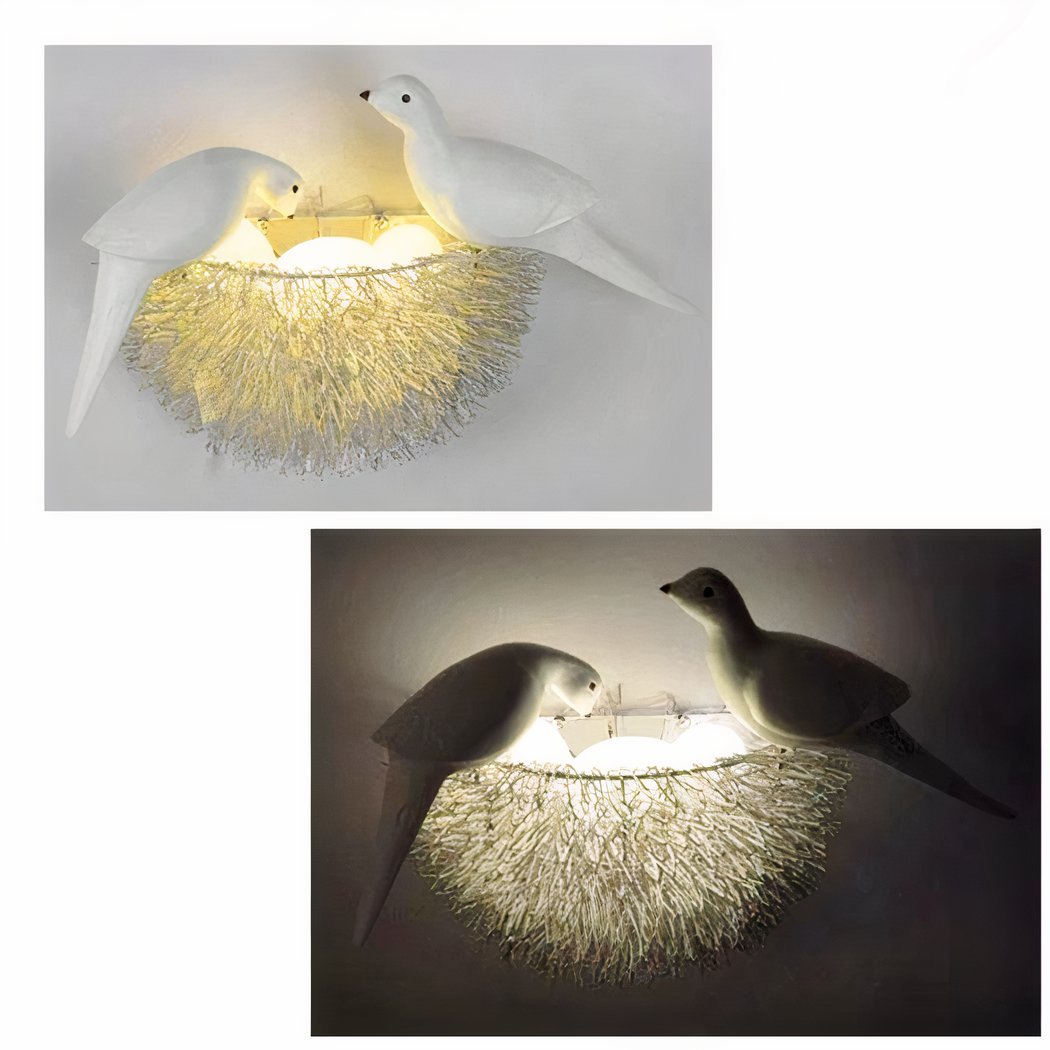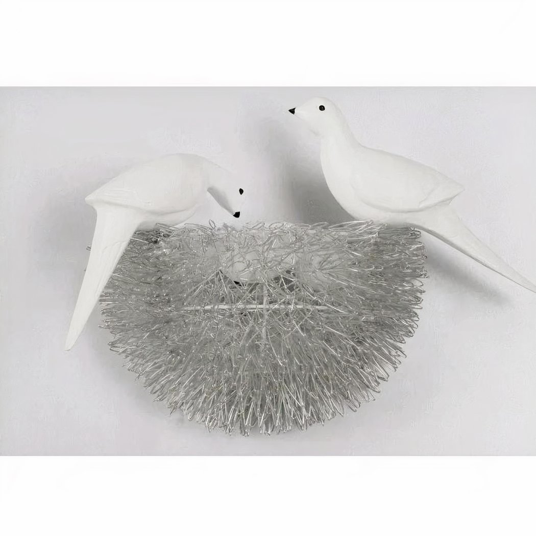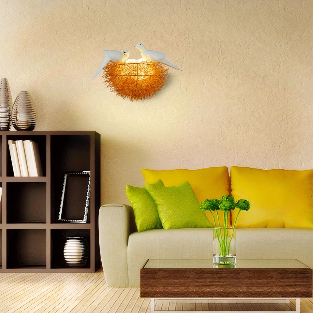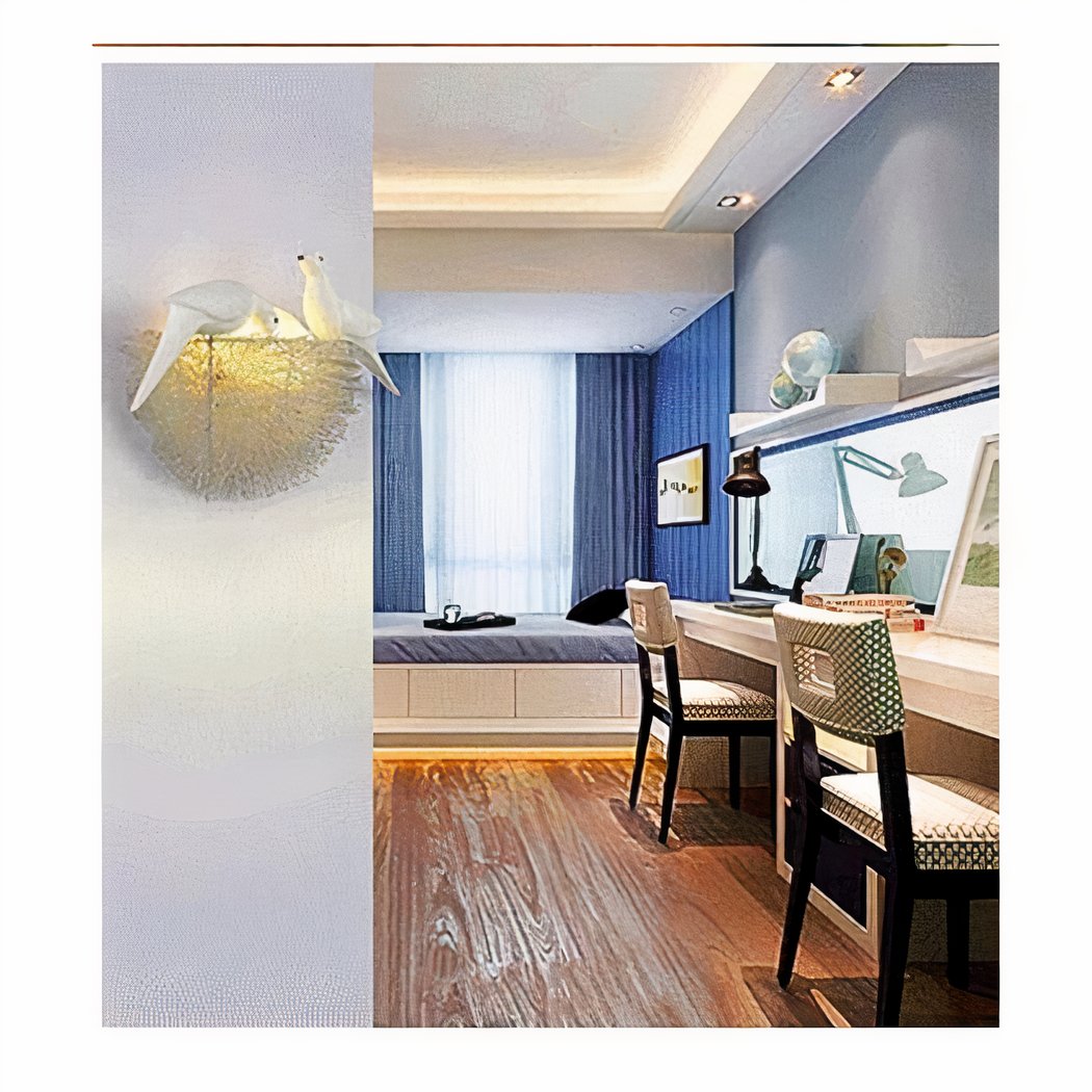 Onze wandlamp geeft een origineel tintje aan je interieurdecoratie dankzij het unieke aluminium ontwerp. Het is voorgesteld als een gezellig nestje en heeft twee witte vogeltjes die delicaat op de rand zijn geplaatst en gemaakt zijn van hars van hoge kwaliteit.